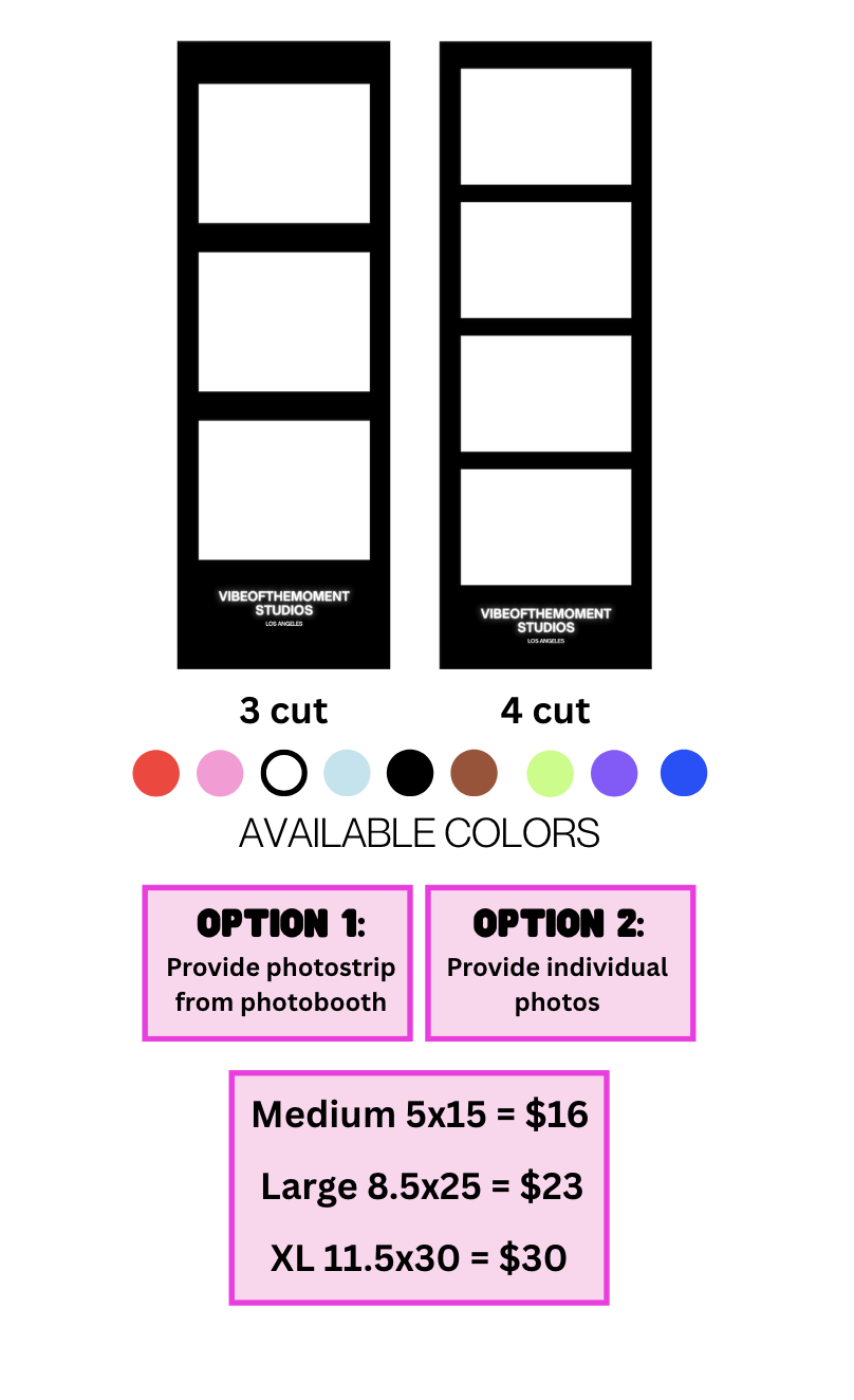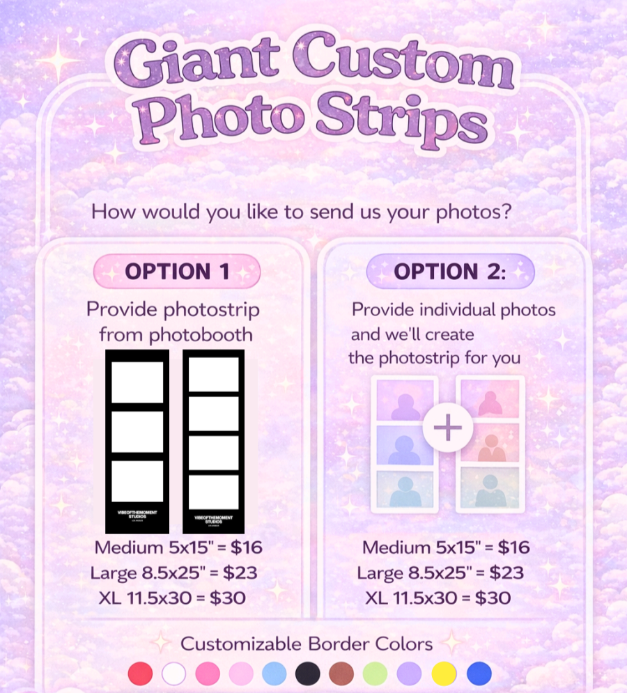 For Giant Photo strip prints, you can either provide us your digital photobooth photos or your individual photos.